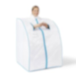 Bastun blir 65 grader varm inom 10 minuter, väger endast 5,5 kg och monteras på en minut. Du sitter på en medföljande stol, har huvudet utanför och andas frisk luft. Efter användning kan den infraröda bastun lätt packas ihop plant och stuvas undan. Det enda du behöver är ett eluttag.