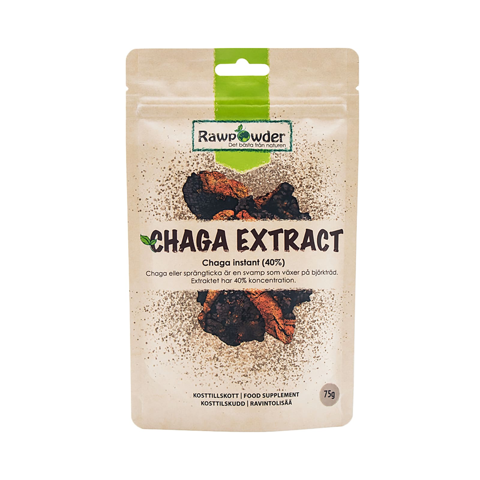 Chaga eller sprängticka är en svamp som växer på björkträd i kallare klimat. Rawpowders Chaga extrakt består av ett 40%-igt extrakt koncentration.