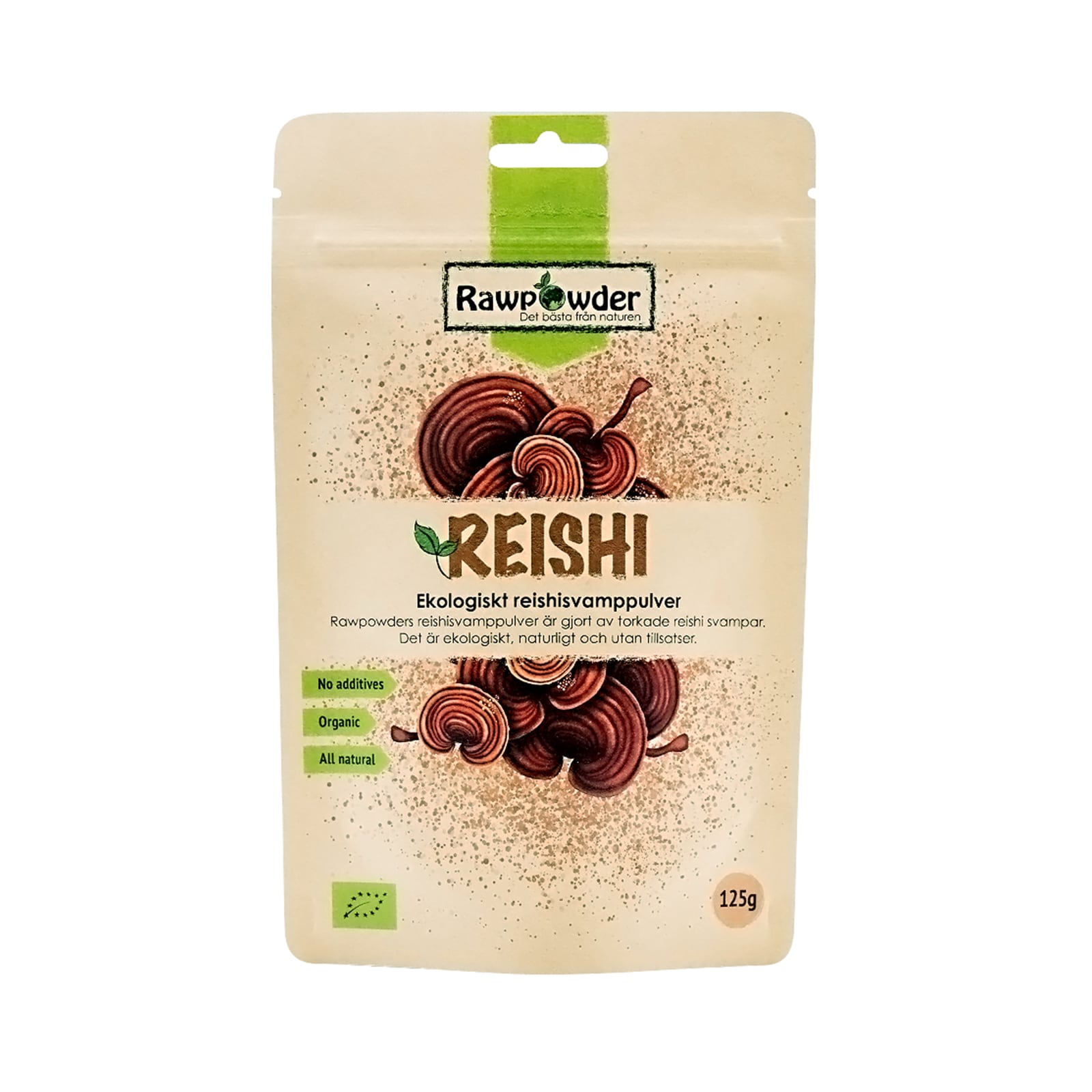 Reishi eller Lackticka är en vildväxande svamp som helst växer på stubbar och rötter av lövträd. Rawpowders reishisvamppulver är gjort av torkade reishi svampar. Det är ekologiskt, naturligt och utan tillsatser.