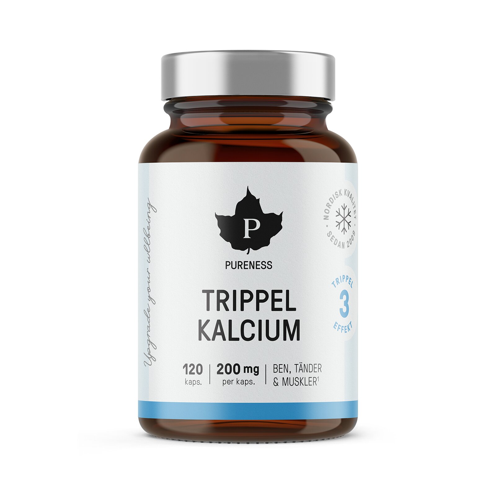 Pureness Trippel Kalcium kombinerar tre förstklassiga former av kalcium: kalciumkarbonat, kalciummalat och kalciumbisglycinat. Denna balanserade formula säkerställer att din kropp drar nytta av de unika egenskaperna hos varje kalciumform. Kalcium är ett essentiellt mineral som är avgörande för att bibehålla normala ben och tänder. Dessutom stödjer kalcium normal muskelfunktion och spelar en roll i energiomsättningen. Veganvänlig och tillverkad i Finland, Trippel Kalcium är utvecklad för dem som vill stödja sin ben- och muskelhälsa på ett naturligt och effektivt sätt. Inga kompromisser – bara ingredienser av högsta kvalitet utan onödiga tillsatser.