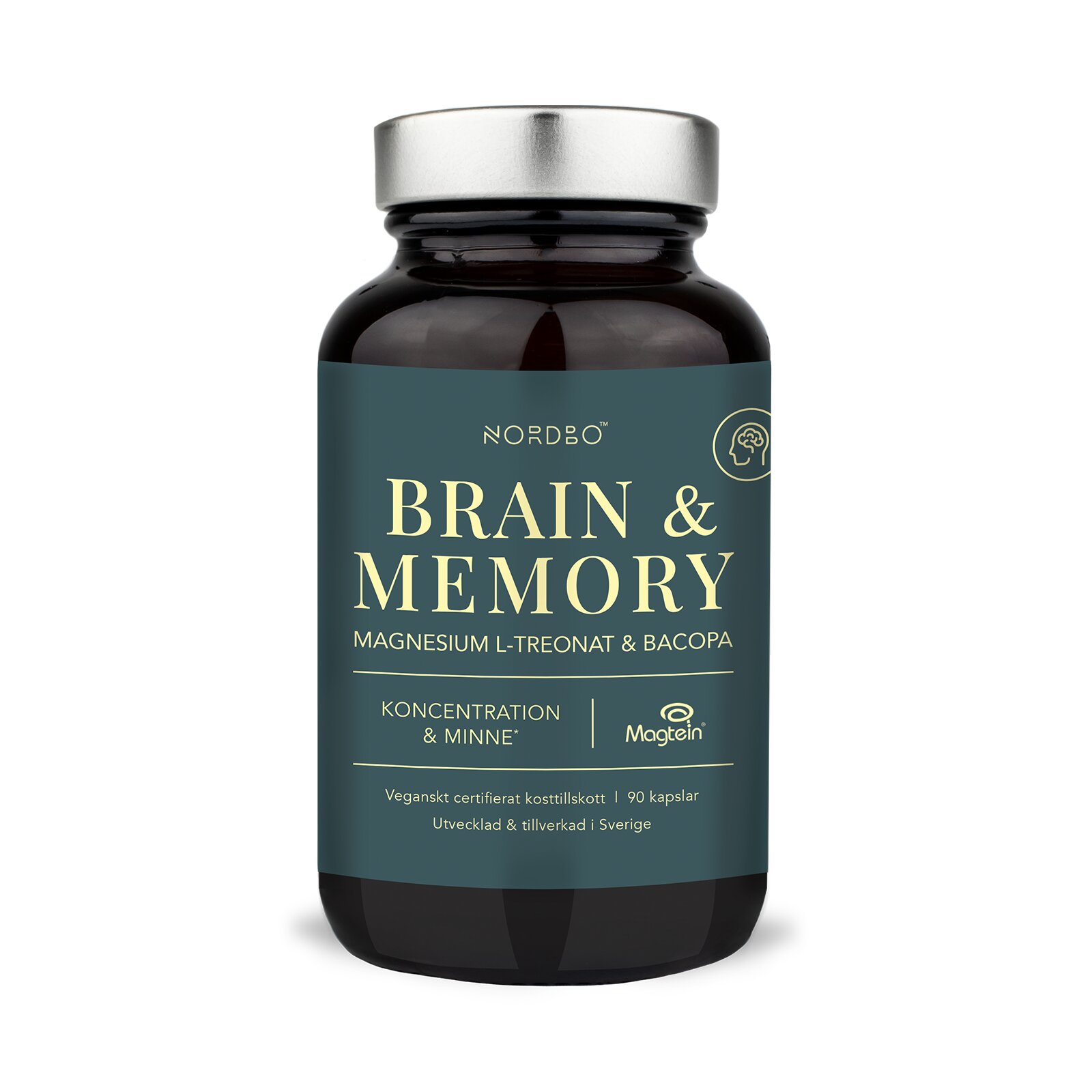 NORDBO Brain & Memory är framtagen för minne, koncentration och psykologisk funktion. Med Magtein®, magnesiumbisglycinat och Ebel.One™. Magtein® är en patenterad ingrediens med magnesium L-treonat, vilket innebär att magnesium har bundits till aminosyran L-treoninsyra. Denna form upptäcktes vid Massachusetts Institute of Technology och har utvecklats för att förbättra upptaget av magnesium i hjärnan. L-treoninsyran ger en unik kemisk struktur som underlättar passagen genom blod- och hjärnbarriären. Magnesium L-treonat används därför särskilt för sina neurologiska fördelar, såsom förbättrad kognitiv funktion och minne samt minskad mental stress. Kapslarna innehåller även magnesiumbisglycinat, som har hög biotillgänglighet och är skonsam för magen. Magnesium bidrar till att bibehålla normal psykologisk funktion samt till minskad trötthet och utmattning. Ebel.One™ är ett extrakt av bacopa, även känt som litet tjockblad. Bacopa innehåller bacosider, som utgör växtens aktiva föreningar. Bacosiderna kopplas till flertalet kognitiva fördelar. Bacopa bidrar till att bibehålla normal kognitiv funktion, koncentration och minne. Brain & Memory rekommenderas särskilt för äldre samt vid studier, trötthet och stress. Brain & Memory är veganskt certifierad av Djurens Rätt och fri från gluten, socker, soja och laktos. Produkten är utvecklad och tillverkad i Sverige av NORDBO - ett familjeägt varumärke från Malmö, som tar fram kosttillskott utifrån innovation, dokumentation och hållbarhet. Burken är tillverkad av glas och locket av metall. Glas och metall kan återvinnas oändligt och ger ett fullständigt skydd mot fukt och luft.