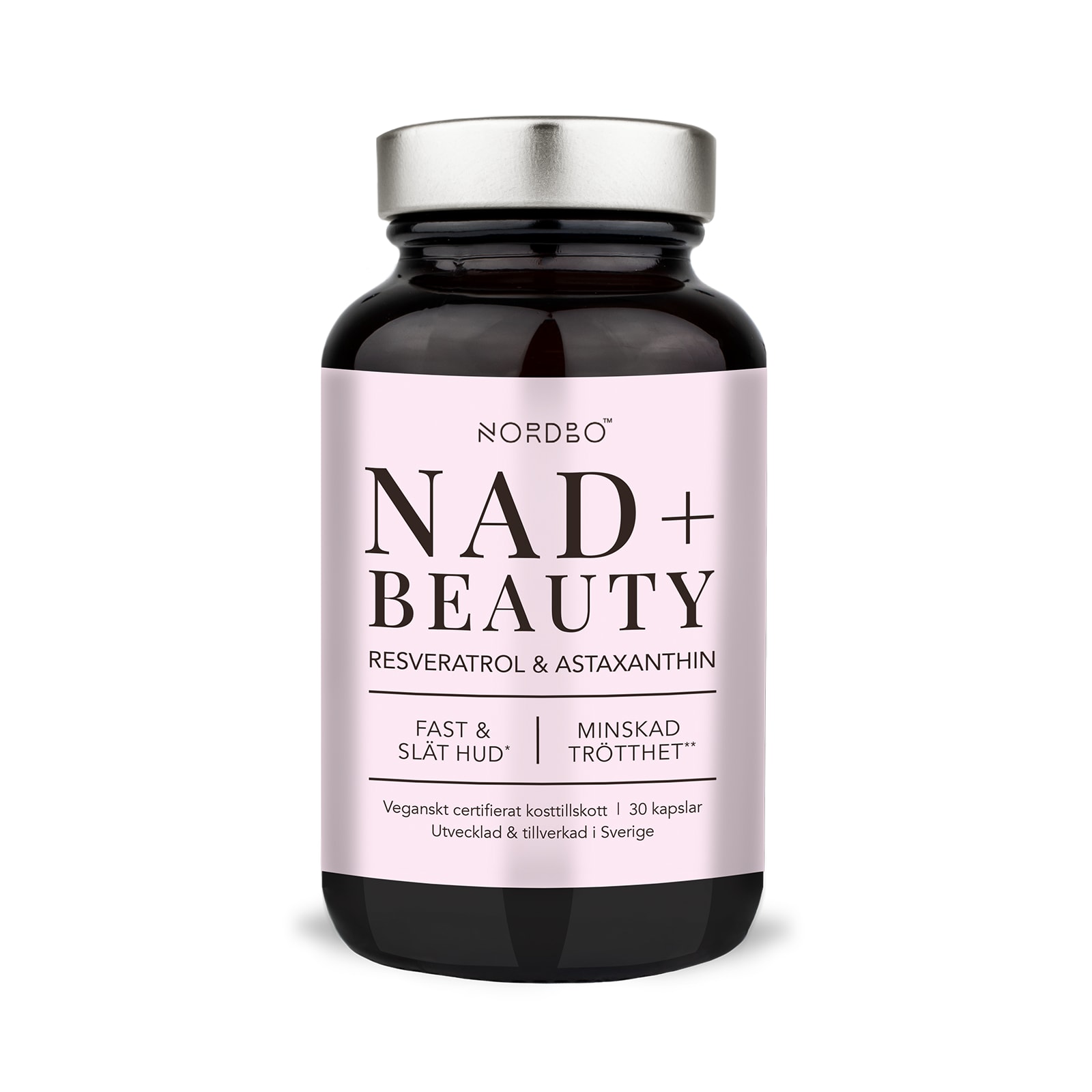 Nordbo NAD+ Beauty är ett synergistiskt hudvårdskomplex inom healthy aging. Med fyra aktiva ingredienser: nikotinamidribosidklorid, resveratrol, AstaBead™ (astaxanthin) och vitamin C. För slätare hy, hudens kollagenproduktion och skydd mot oxidativ stress. Nikotinamidribosidklorid är saltformen av nikotinamidribosid, även kallat NR. NR är en typ av vitamin B3 som utgör ett förstadium till det aktiva coenzymet NAD+ och omvandlas till detta i kroppen. NAD+ behövs för att mitokondrierna (cellernas kraftverk) ska producera och aktivera energi samt minska oxidativ stress i cellerna. Nivåerna av NAD+ i kroppen minskar med åldern. Studier indikerar att NAD+ stödjer hudens naturliga regenerering, vilket gör det till en intressant ingrediens i hudvård inifrån. Resveratrol är en polyfenol som finns naturligt i bl.a. parkslide och är en populär ingrediens i både inre och yttre hudvård. Det är en välstuderad antioxidant, som bidrar till att skydda celler mot fria radikaler och oxidativ stress - en viktig mekanism för att sakta ned hudens åldrande. Resveratrol bidrar även till att balansera inflammationssvaret i huden, vilket kan minska finnar och jämna ut hudtonen. AstaBead™ är ett isländskt, standardiserat extrakt av astaxanthin, ett pigment utvunnet ur mikroalger. Astaxanthin är en av naturens mest potenta antioxidanter och har dokumenterad effekt på hudens fasthet, elasticitet och lyster. Studier visar att astaxanthin bidrar till att förbättra hudstrukturen, öka fuktbalansen och minska djup i fina linjer och rynkor. AstaBead™innehåller 5% astaxanthin, vilket gör det till en av de mest potenta källorna. Vitamin C bidrar till normal kollagenbildning, vilket har betydelse för hudens normala funktion. Vitamin C stödjer också immunsystemets normala funktion och skyddar cellerna mot oxidativ stress. Kalciumaskorbat är en syraneutral form av vitamin C som är skonsam för magen. Ett perfekt tillskott för dig som vill kombinera hudhälsa och longevity. NAD+ Beauty är veganskt certifierad av Djurens Rätt. Produkten är fri från animaliska ingredienser samt gluten, socker, soja och laktos. Produkten är utvecklad och tillverkad i Sverige av Nordbo - ett familjeägt varumärke från Malmö, som tar fram kosttillskott utifrån innovation, dokumentation och hållbarhet. Burken är tillverkad av glas och locket av metall. Glas och metall kan återvinnas oändligt och ger ett fullständigt skydd mot fukt och luft.