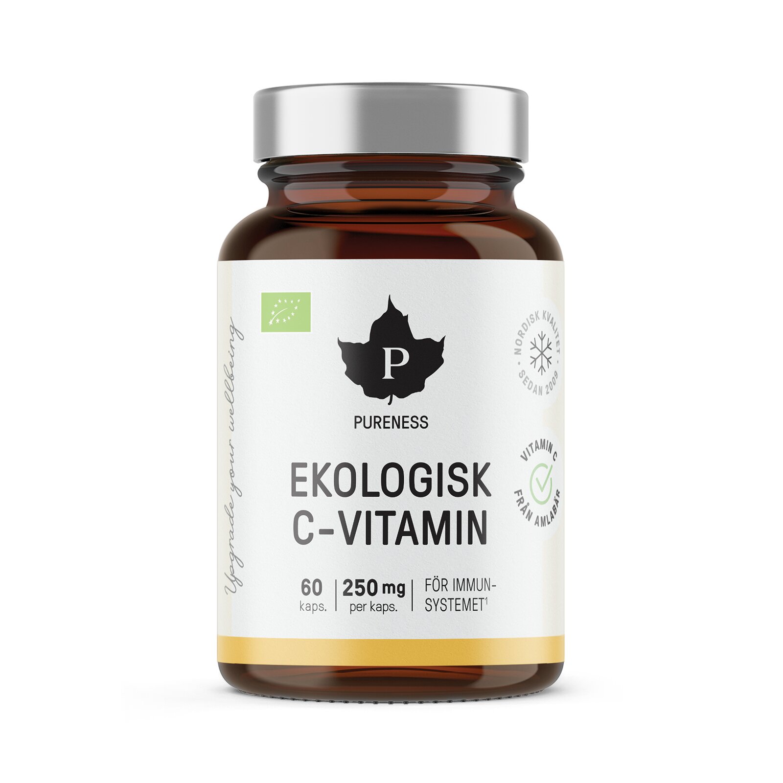 Pureness Ekologiska C-Vitamin innehåller Vitamin C extraherat från amlabär i praktisk kapselform. Vitamin C bidrar till immunsystemets normala funktion och att behålla den under och efter intesiv fysisk träning. Dessutom bidrar den till normal kollagen-bildning, vilket har betydelse för normal funktion hos hud, benstomme, blodkärl och brosk. Vitamin C bidrar också till nervsystemets normala funktion samt normal energiomsättning. Vegansk produkt
