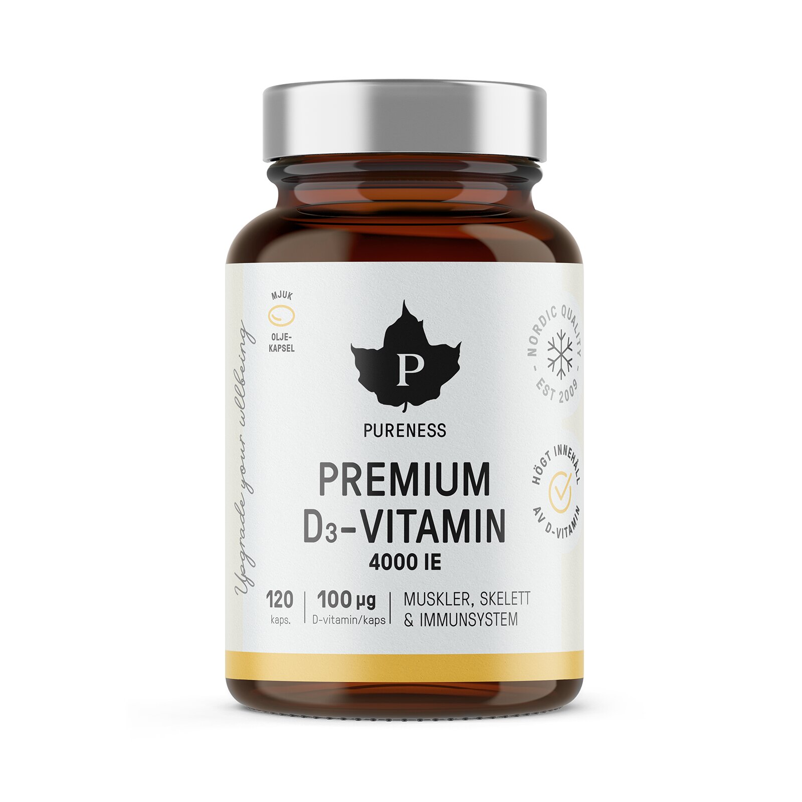 Pureness D-vitamin är ett 100 μg D3-vitaminpreparat. Den mjuka kapseln fylld med torskleverolja innehåller naturligt vitamin A och vitamin D, dessutom kompletteras den med vitamin D3 från fårullsfett. I naturen är D-vitamin rikligast i fiskfett, vilket är varför högkvalitativ fiskolja har valts som bas för produkten. Fiskolja säkerställer en hög absorption av vitamin D. D-vitamin bidrar till musklernas, benstommens och immunsystemets normala funktion.