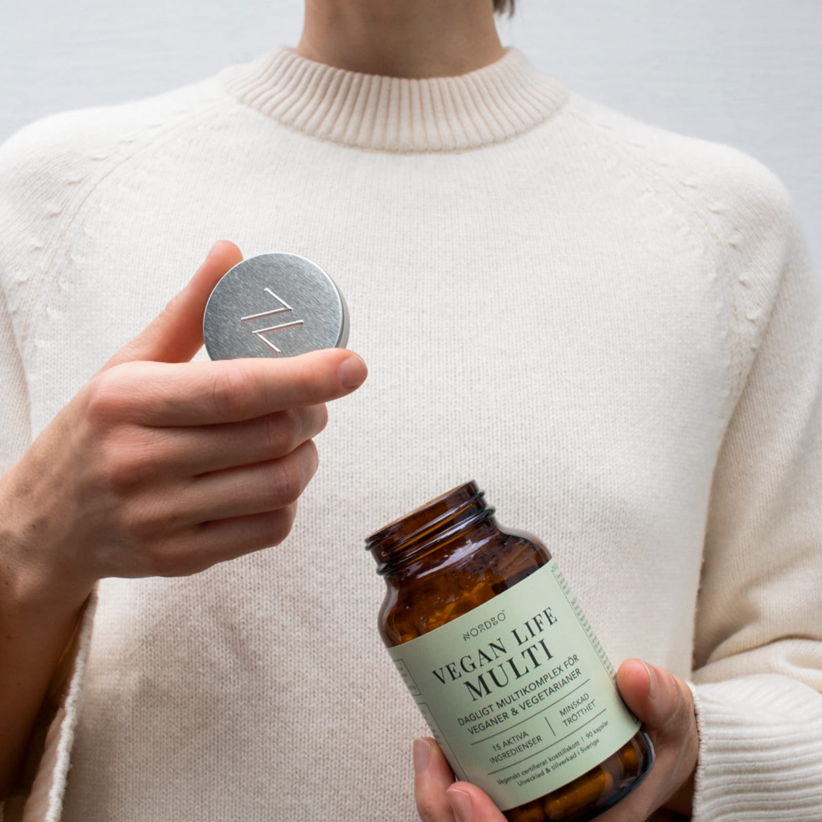 NORDBO Vegan Life Multi är framtagen för veganers och vegetarianers dagliga behov. Med ingredienser som bidrar till minskad trötthet, normal psykologisk funktion och nervsystemets normala funktion.