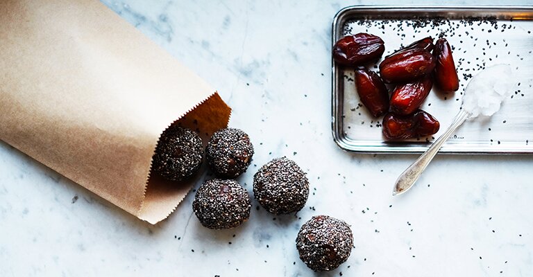 2. Forma smeten till små bollar och rulla dem i chiafrön, lägg på ett fat och ställ in i kylen. När bollarna stelnat, förvara dem i en burk med lock.
