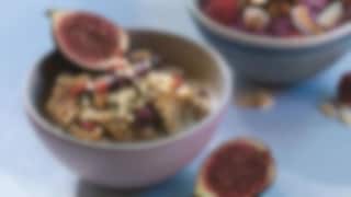 - När havreblandningen har satt sig, tillsätt de krossade digestivekexen och de mosade jordgubbarna. Toppa med cheesecakekrämen och låt stå över natten.