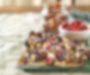 4. Blanda försiktigt ner små bitar kolasmet i nöt- och bärblandningen. Häll i chokladen och blanda runt. Sprid ut smeten på ett bakplåtspapper och låt stelna i kylen. Skär i munsbitar. Förvara i kylskåp.
