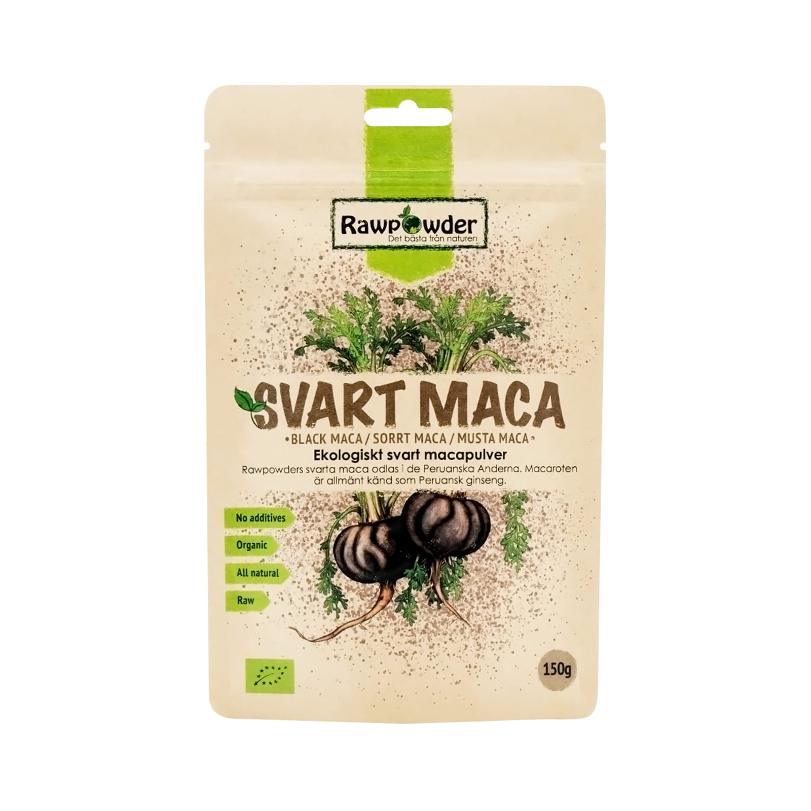 Rawpowders svarta maca odlas i de Peruanska Anderna. Macaroten är allmänt känd som Peruansk ginseng. Smaken av macaroten påminner lite om pepparrot och palsternacka. Pulvret är utan tillsatser.