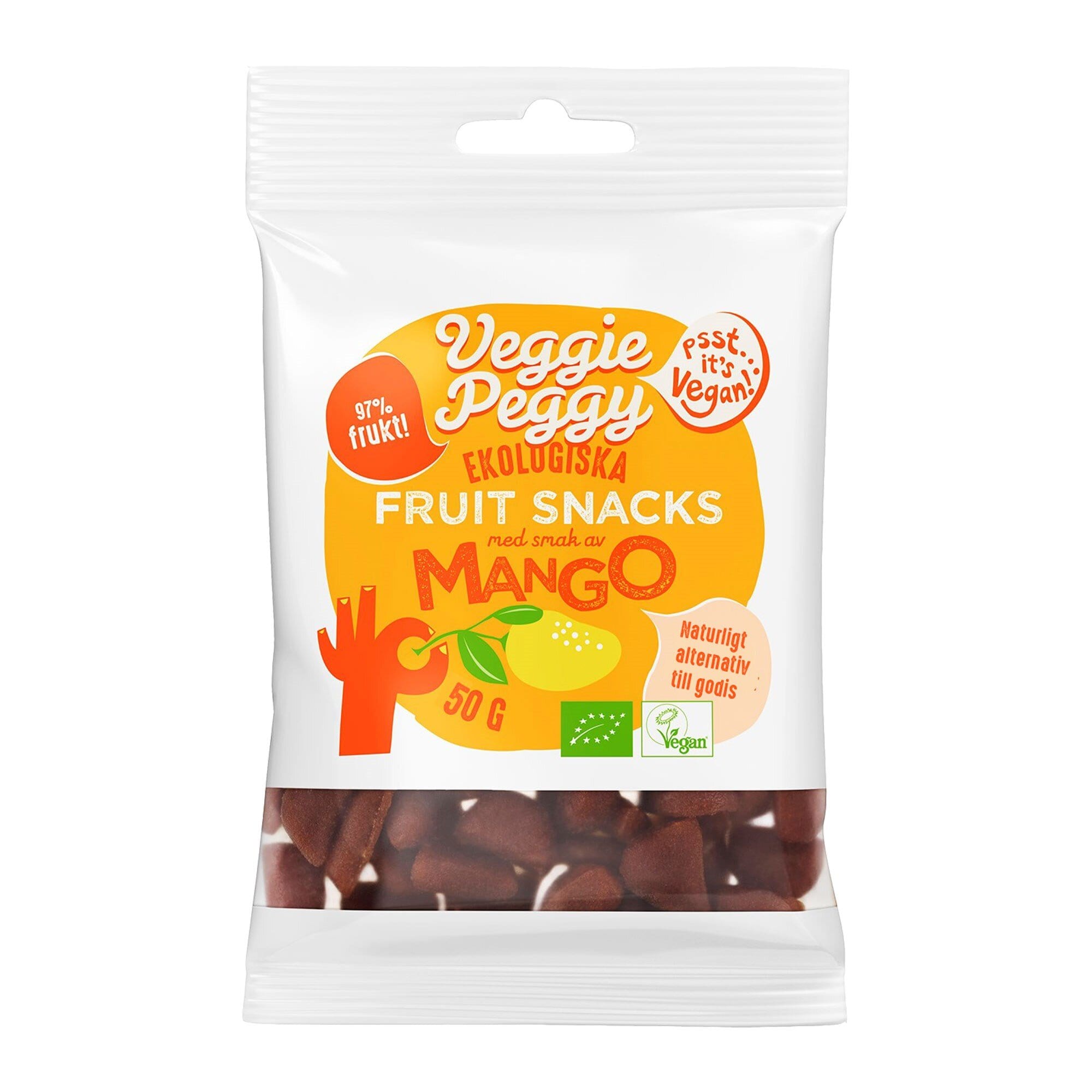 Veggie Peggy Fruit Snacks Mango är veganska och ekologiska fruktgodisar med Mangosmak av 97 % frukt. Fri från gelatin. Naturligt gott för stora och små.