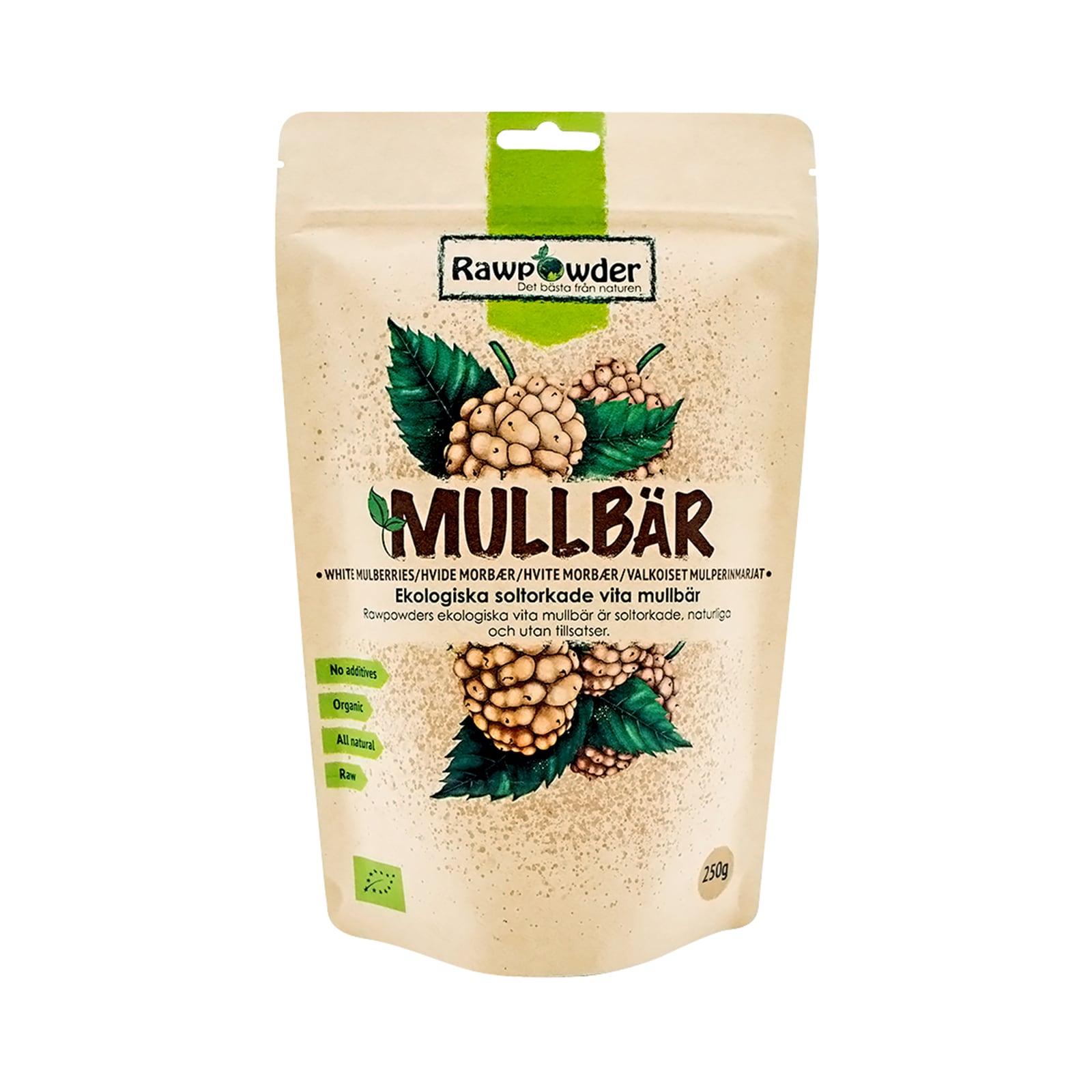 Mullbär växer på träd som kan bli mellan 5 och 20m höga. De finns i flera olika färger: vita, svarta, rosa och röda. Vita mullbär har en söt honungssmak, väldigt goda att äta som snacks, på gröten eller ta några efter maten. Våra ekologiska vita mullbär är soltorkade, naturliga och utan tillsatser.