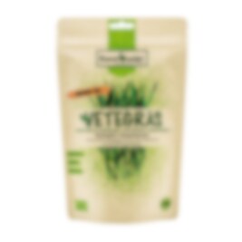 Vetegräspulver är ett pulver gjort på torkat vetegräs och är naturligt fritt från gluten. Det är utan tillsatser och en bra källa till proteiner. Rawpowders vetegräs kommer från den lummiga delen av veteplantan Triticum aestivum och skördas när plantan fortfarande är ung.