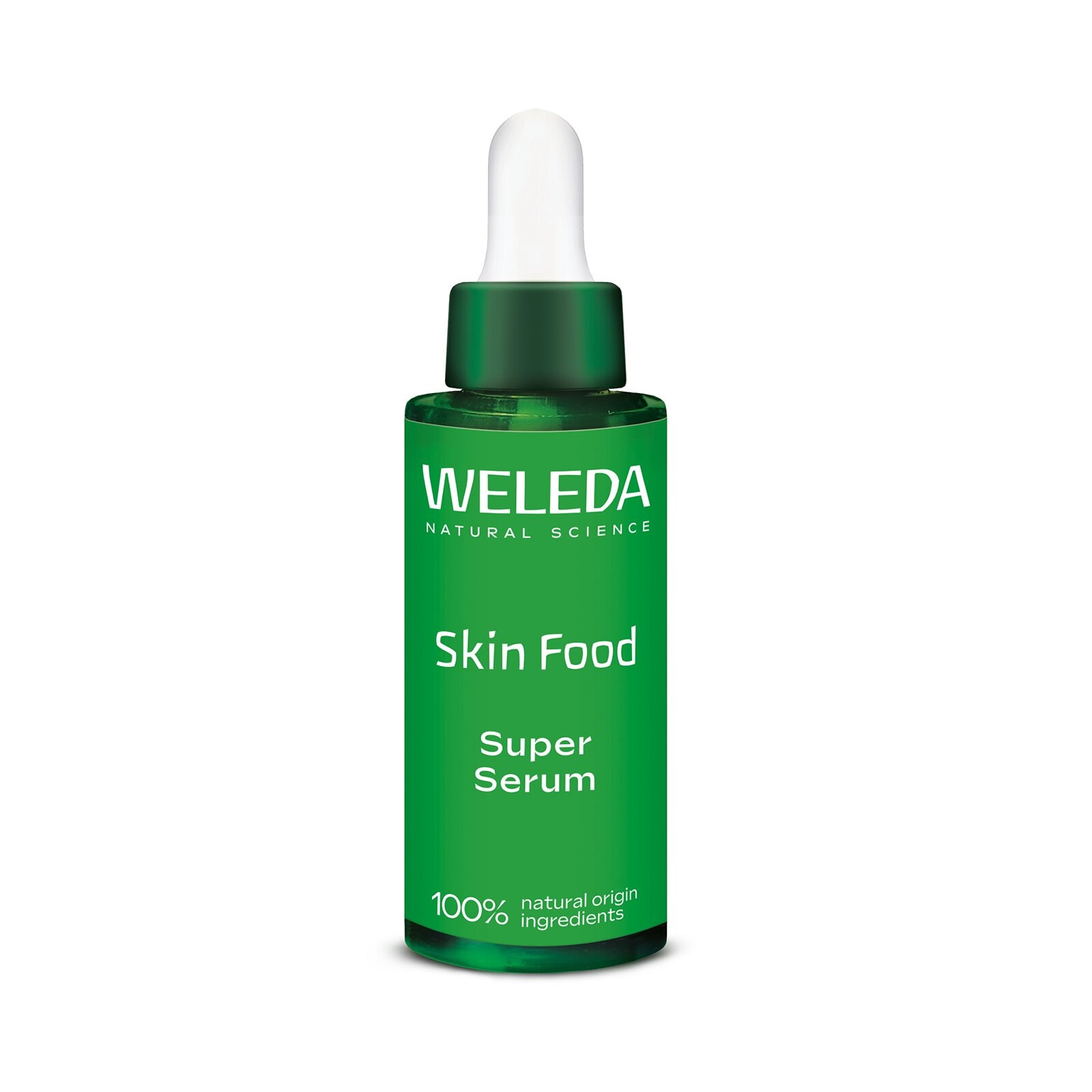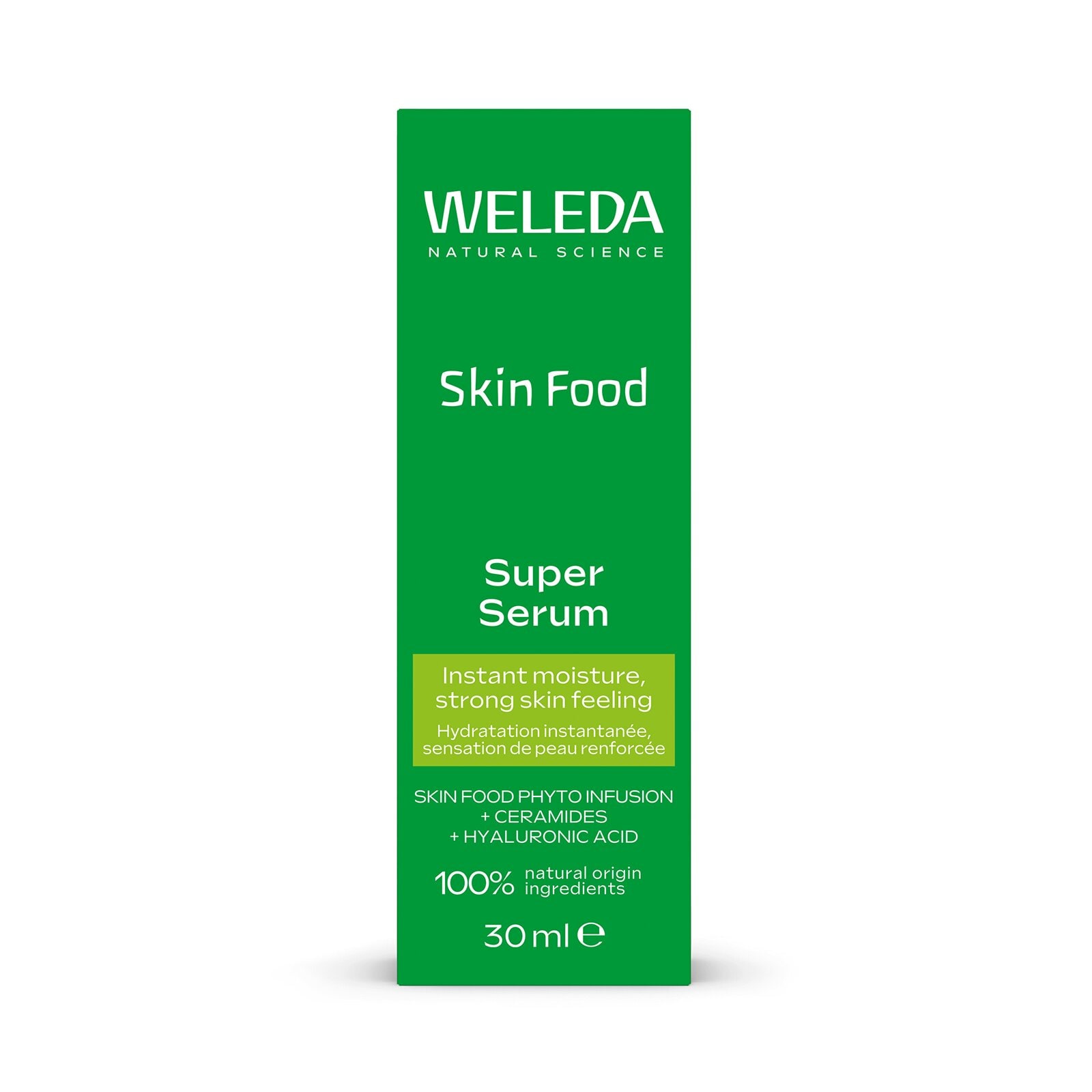 Skin Food Super Serum ger omedelbar återfuktning med hyaluronsyra, ceramider och växtextrakt – för frisk lyster utan klibbig känsla. Naturligt och veganskt._x000B__x000B_Weleda Skin Food Super Serum är ett kraftfullt men lätt ansiktsserum som ger torr och glåmig hud naturlig lyster och fukt. Den vårdande formulan innehåller naturligt certifierad hyaluronsyra, ceramider och det ikoniska Skin Food phyto infusion – en blandning av 100 % naturliga växtextrakt från styvmorsviol, kamomill, ringblomma, och rosmarin. Serumet absorberas snabbt, kladdar inte och stärker hudens naturliga mikrobiom. Vegansk, dermatologiskt testad.
