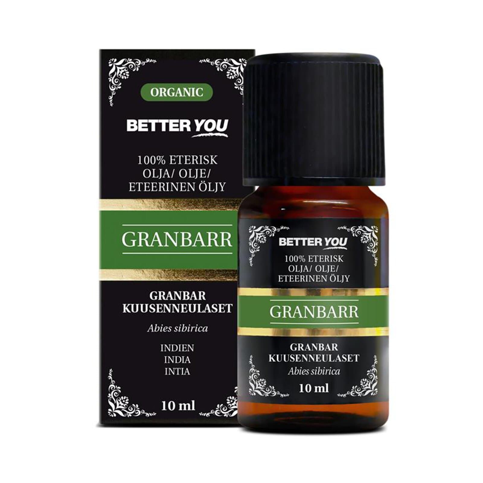 Better You Granbarrsolja (Abies sibirica) är en eterisk olja med en fräsch och uppiggande karaktär. Doften påminner om nordiska skogar och har en grön, frisk ton. Oljan är 100 % ekologisk och utvinns genom ångdestillering av granbarr från ädelgran, vilket bevarar dess naturliga arom och rena kvalitet. Granbarrsolja är en frisk toppnot som passar bra ihop med oljor som citrus (apelsin, citron, grapefrukt), lavendel, rosmarin och andra barrdofter som tall eller enbär. Den kan användas i aromalampa eller diffuser för att sprida en skogslik atmosfär i hemmet, eller blandas ut i en vegetabilisk olja för egen hud- och massageolja. Precis som med alla eteriska oljor ska den alltid användas utspädd på huden och förvaras oåtkomlig för barn.