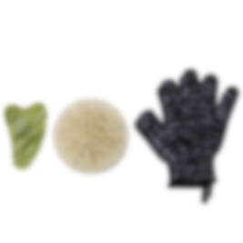 EcoTools Glow From Head To Toe Kit är det perfekta setet för egenvård och avkoppling. Setet innehåller 3 verktyg för kroppen och ansiktet: en torrborste, ett par duschhandskar och en Gua Sha sten. Torrborsten bör användas före duschen för bästa resultat, den exfolierar huden varsamt och resultatet blir en slät hud med lyster. Duschhandskarna är berikade med kol för optimal detox. De exfolierar huden effektivt i duschen eller i badet och kan användas tillsammans med din favoritrengöring eller skrubb. Gua Sha stenen är ett effektivt massageverktyg som minskar muskelanspänningar, värk och ömhet. Stenen kan med fördel användas tillsammans med en lotion, olja eller ditt favoritserum. Glow From Head To Toe Kit kommer i begränsad upplaga och är den perfekta presenten för både kvinnor och män. EcoTools sortiment av egenvård- och badprodukter är både bra för dig och planeten. Som med alla EcoTools-produkter är detta kit 100 % cruelty free och veganskt.