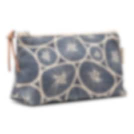 Necessär/makeupväska med tryckt mönster i fodrad ekologisk bomull. Dragkedja med lädertamp. Design Ulrika Gyllstad och tillverkad i Sverige och EU.