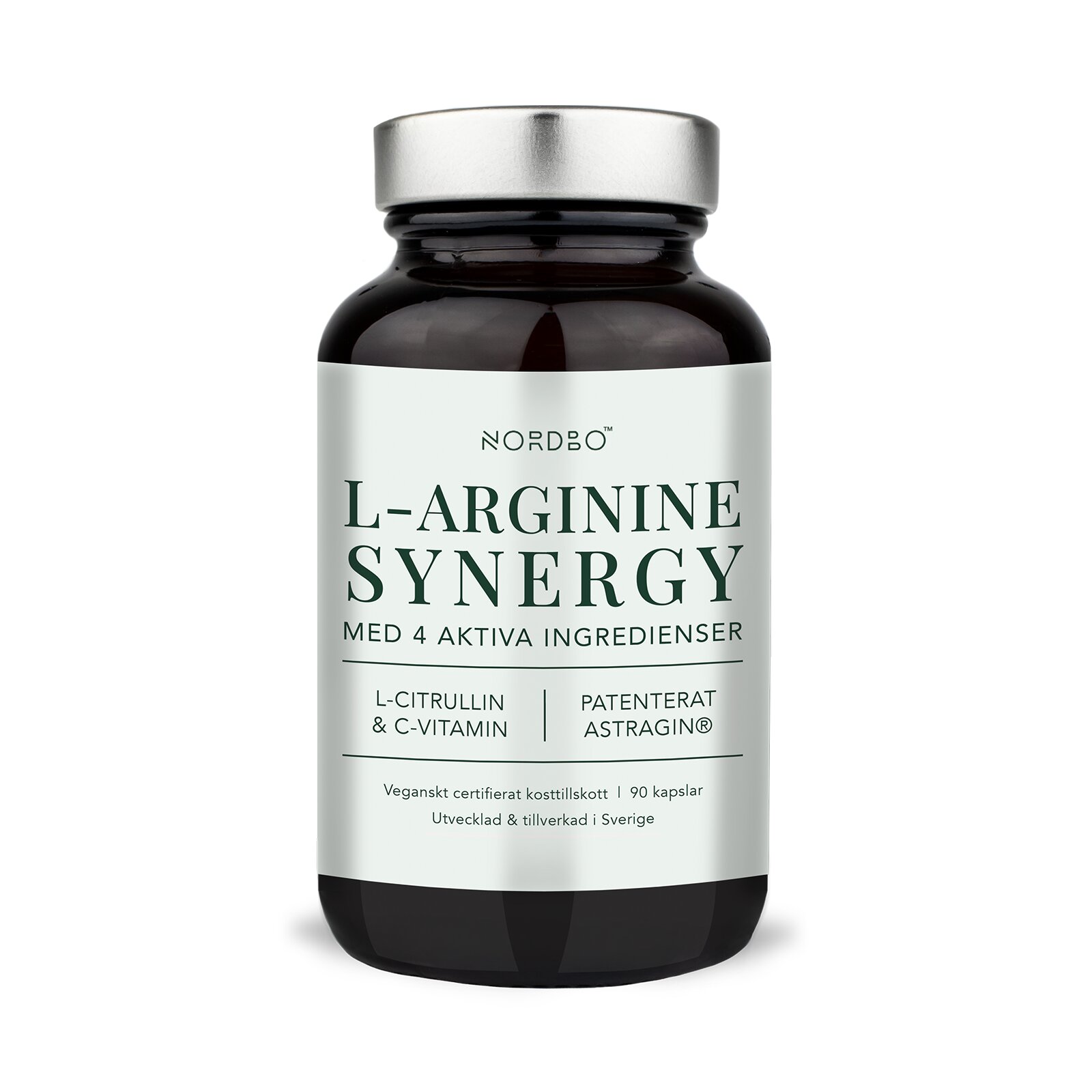 NORDBO L-Arginine Synergy är ett synergistiskt komplex som kombinerar aminosyrorna L-arginin och L-citrullin med C-vitamin (kalciumaskorbat) och Astragin®. L-arginin är en semi-essentiell aminosyra, vilket innebär att kroppen normalt kan producera den själv, men vid ökad belastning (som träning eller stress) kan behovet öka. I kroppen fungerar arginin som en föregångare till kväveoxid, en molekyl som hjälper till att reglera kärlens vidgning. Arginin finns naturligt i proteinrika livsmedel som kött, fisk, baljväxter och nötter. L-citrullin är en aminosyra som kroppen omvandlar till arginin. Citrullin anses ha en längre och jämnare effekt på argininnivåerna i blodet än att enbart ta arginin, eftersom det undgår viss nedbrytning i tarmen och levern. Denna egenskap gör att citrullin ofta kombineras med arginin för att ge ett mer stabilt och långvarigt tillskott av kväveoxid. Kombinationen av L-arginin och L-citrullin är särskilt fördelaktig vid uthållighet, cirkulation och träning – men även i andra sammanhang där dessa egenskaper är önskvärda. C-vitamin av kalciumaskorbat är en syraneutral form av vitamin C som är skonsam för magen. Vitamin C bidrar till att skydda cellerna mot oxidativ stress, till att bibehålla immunsystemets normala funktion, normal energiomsättning samt till att minska trötthet och utmattning. Astragin® är ett patenterat växtextrakt av astragalus och notoginseng. Astragin® har i studier visat sig öka bioupptaget av aminosyror, vitaminer och mineraler genom att stödja upptaget i tarmcellerna. Det gör detta genom att påverka proteiner i tarmslemhinnan (bl.a. SGLT1 och CAT1) som ansvarar för näringsupptag. Resultatet blir en förbättrad tillgänglighet av näringsämnen till kroppen. I samband med träning tas L-Arginine Synergy med fördel innan träningspasset. Aminosyror tas gärna på fastande mage för optimalt upptag, men vid känslig mage kan de tas med måltid. L-Arginine Synergy är veganskt certifierad av Djurens Rätt och fri från gluten, socker, soja och laktos. Produkten är utvecklad och tillverkad i Sverige av NORDBO – ett familjeägt varumärke från Malmö som tar fram kosttillskott utifrån innovation, dokumentation och hållbarhet. Burken är tillverkad av glas och locket av metall. Båda materialen kan återvinnas oändligt och skyddar produkten mot fukt och luft.