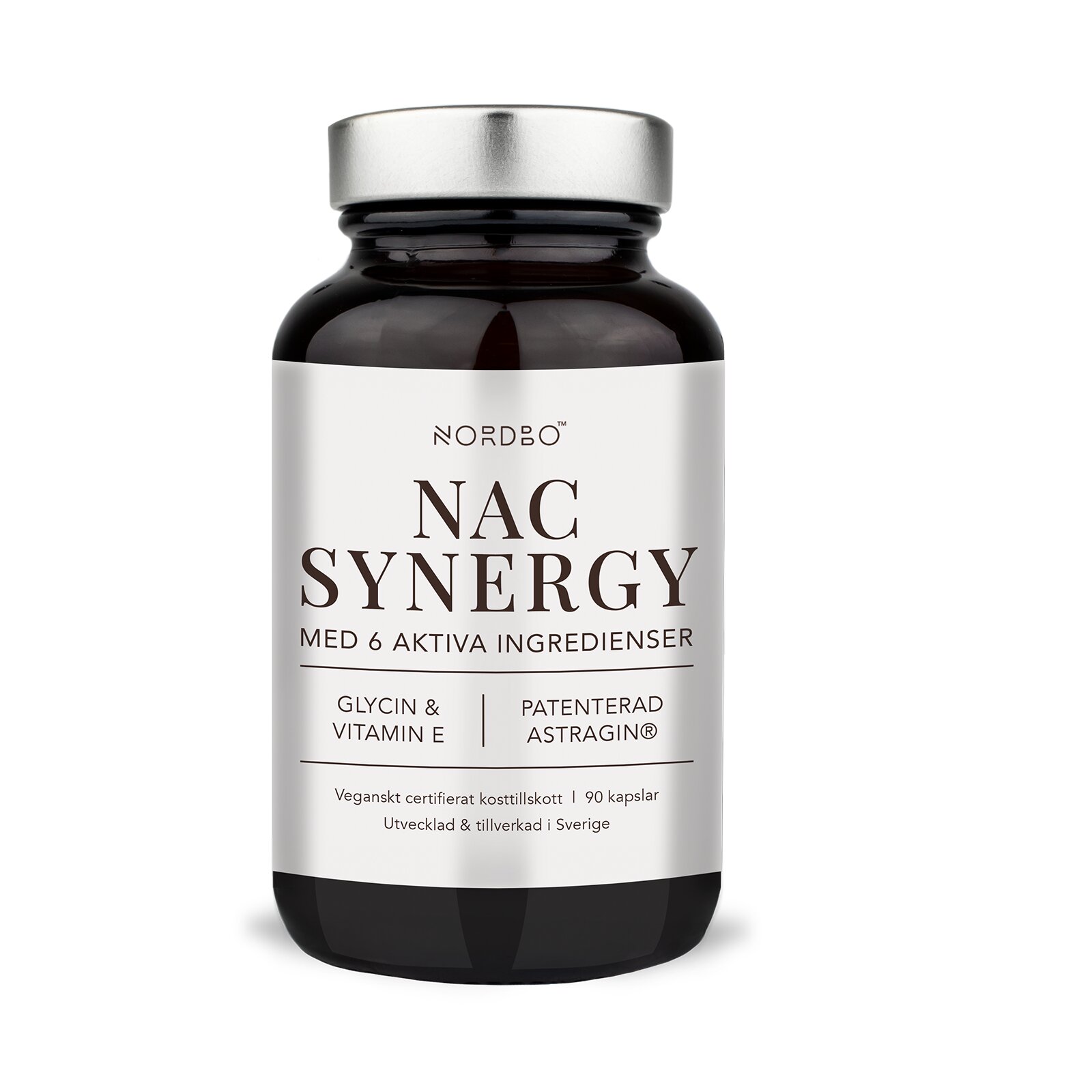 NORDBO NAC Synergy är ett synergistiskt komplex med NAC, vitamin E, vitamin C, glycin och selen. NAC (N-acetyl-L-cystein) är en stabil form av aminosyran cystein, som är en viktig byggsten i kroppens produktion av glutation – en av de mest centrala antioxidanterna i kroppen. Glutation finns i kroppens alla celler och stärker skyddet mot fria radikaler samt stödjer kroppens naturliga reningsprocesser. NAC bidrar också till att upprätthålla en balanserad nivå av cystein i kroppen, vilket är viktigt för många biologiska funktioner. NAC används ofta som tillskott för att komplettera kroppens egna antioxidativa försvar. Vitamin E (d-alfa-tokoferol-succinat) är en fettlöslig antioxidant som bidrar till immunsystemets normala funktion samt till att skydda cellerna mot oxidativ stress. Kalciumaskorbat är en skonsam, syraneutral form av C-vitamin som också bidrar till att skydda cellerna mot oxidativ stress och stödjer immunsystemets normala funktion. Selenmetionin är en form av selen med hög biotillgänglighet. Selen bidrar till att bibehålla immunsystemets normala funktion och normal energiomsättning samt skydd av celler, DNA, proteiner och lipider mot oxidativ stress. Astragin® är ett patenterat växtextrakt av astragalus och notoginseng. Astragin® har i studier visat sig öka bioupptaget av aminosyror, vitaminer och mineraler genom att stödja upptaget i tarmcellerna. Det gör detta genom att påverka proteiner i tarmslemhinnan (bl.a. SGLT1 och CAT1) som ansvarar för näringsupptag. Resultatet blir en förbättrad tillgänglighet av näringsämnen till kroppen. I samband med träning tas NAC Synergy med fördel innan träningspasset. Aminosyror tas gärna på fastande mage för optimalt upptag, men vid känslig mage kan de tas med måltid. NAC Synergy är veganskt certifierad av Djurens Rätt och fri från gluten, socker, soja och laktos. Produkten är utvecklad och tillverkad i Sverige av NORDBO – ett familjeägt varumärke från Malmö som tar fram kosttillskott utifrån innovation, dokumentation och hållbarhet. Burken är tillverkad av glas och locket av metall. Båda materialen kan återvinnas oändligt och skyddar produkten mot fukt och luft.